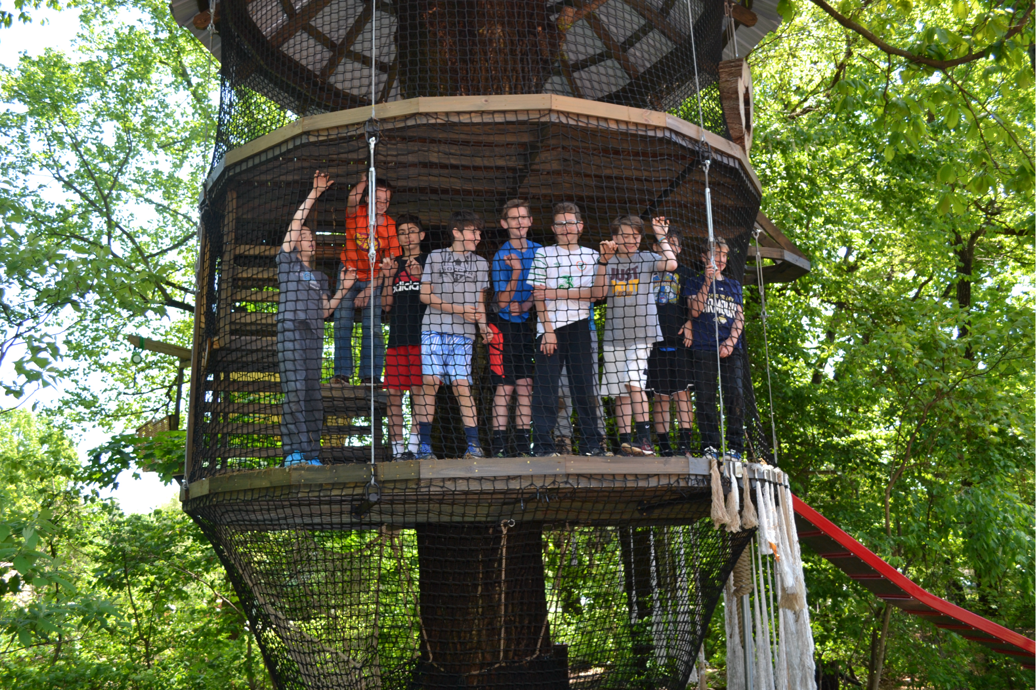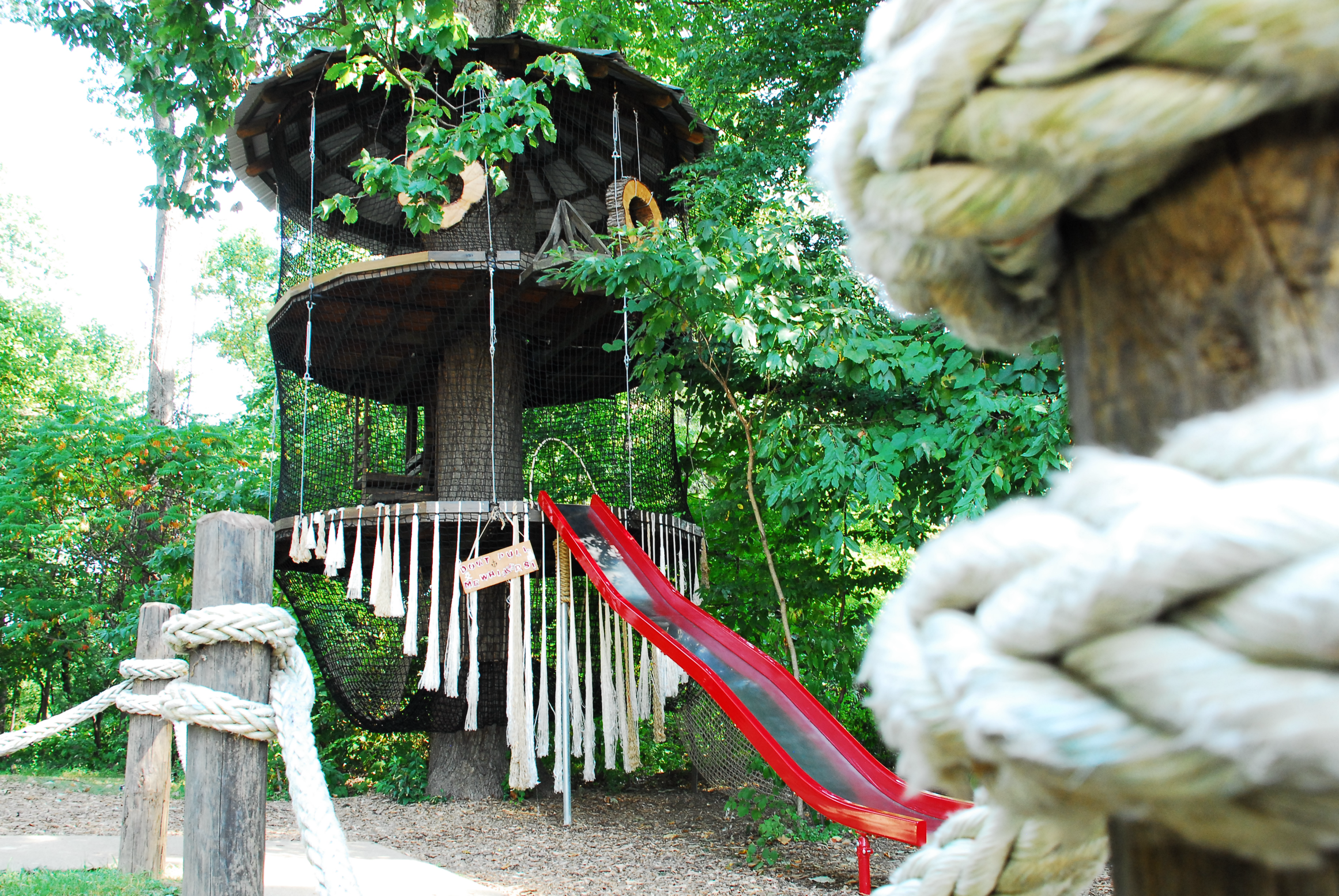 Greybeard is a thrill indeed, with three levels to climb! The first level is made completely out of netting and rope so it has the effect of being a large swinging hammock. The second and third floors of the treehouse are 14′ circles that are stabilized with cables and have netting for walls. With hollow logs for eyes, old manila rope for hair and a sliding board as another way to get down to the ground, Greybeard is a fine-lookin’ lad, full o’ charm and a right pleasure to have in yer crew! 🏴☠️