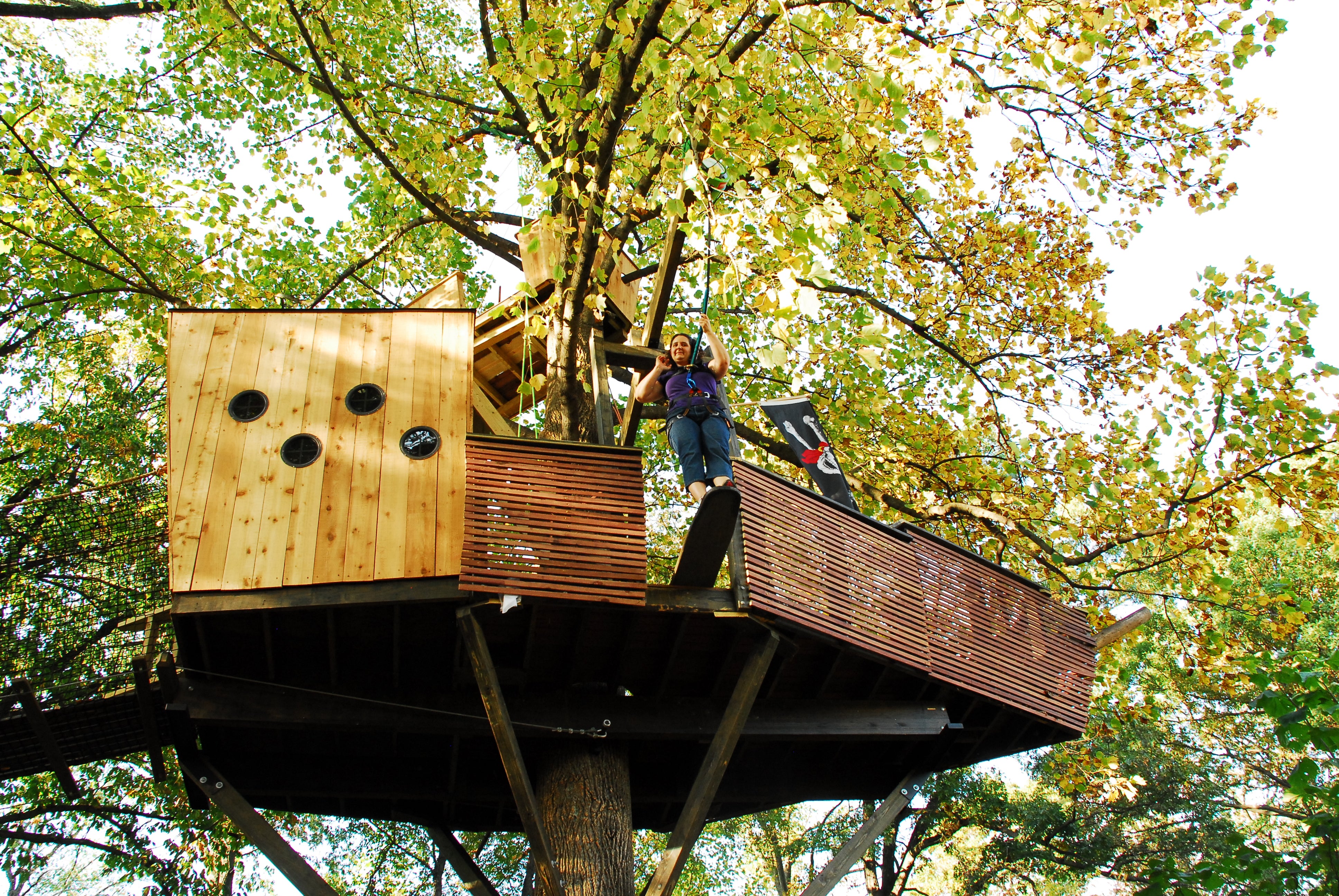 An elevated walkway surrounds the Pirate’s Cove, providing access around 3 sides of the whole area. You can walk from the hedge row tunnels all the way around to the 3rd level of the Greybeard Treehouse, from tree to tree, without touching the ground. The walkway also provides access to the Pirate Ship Treehouse and the Buccaneer Zipline.